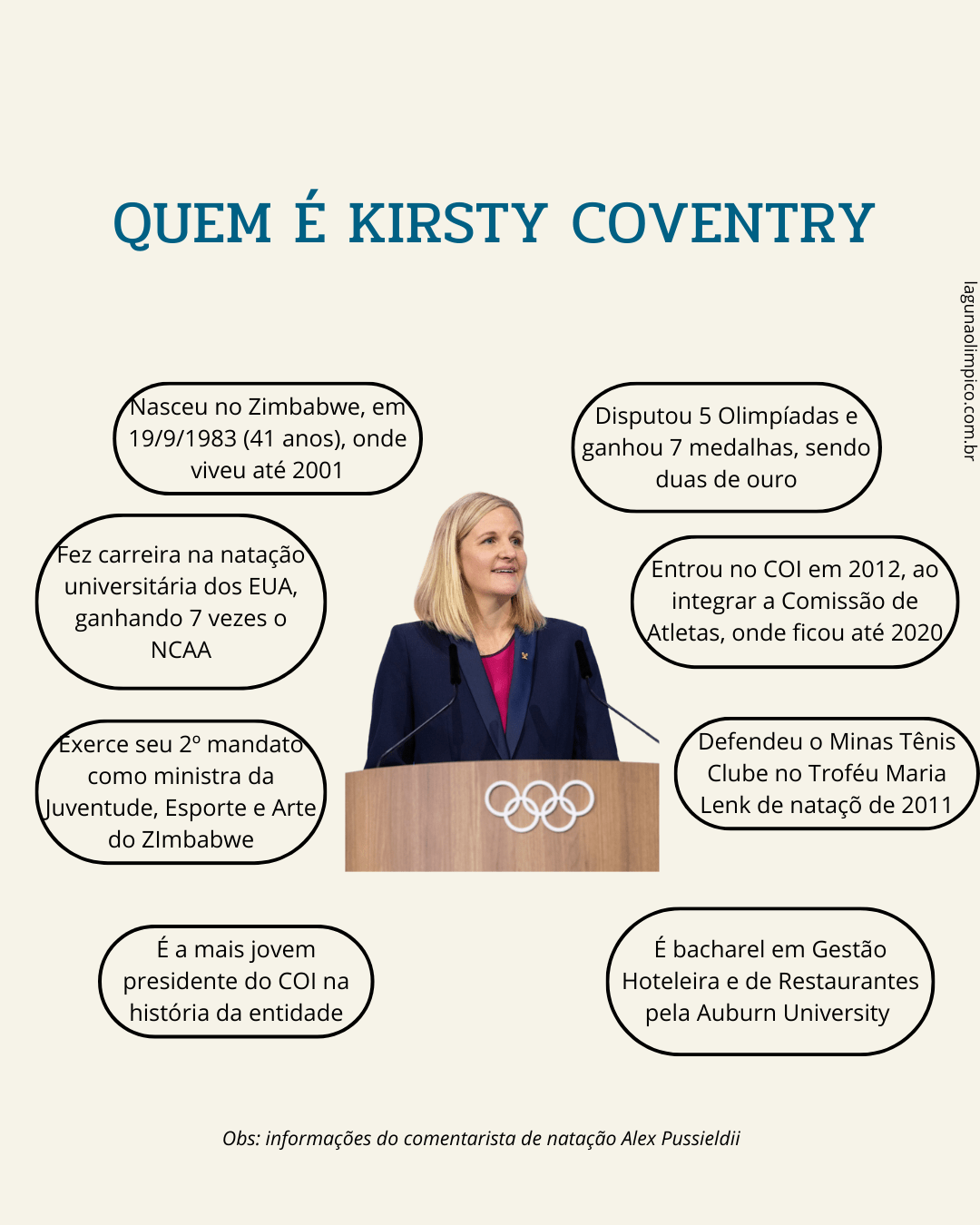 O mundo olímpico ainda está repercutindo a histórica vitória de Kirsty Coventry na eleição para comandar o COI (Comitê Olímpico Internacional). Na última quinta-feira (20), a ex-nadadora e campeã olímpica do Zimbabwe venceu a disputa de forma avassaladora. Ela ganhou ainda no primeiro turno do pleito, durante a 144ª Sessão do COI. Foram 49 votos, a quantidade necessária para fechar a disputa.